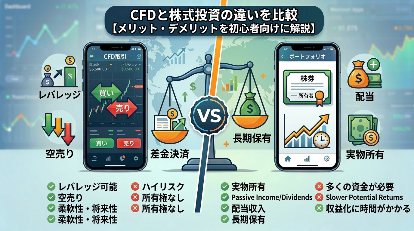 CFDと株式投資はどちらも株式に投資できますが、仕組みや特徴が大きく異なります。この記事では、CFDと株式投資の違いをメリット・デメリットも含めて比較します。